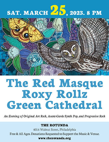 Saturday, March 25, 2023 Prog, Art Rock and Avant Garde Synth Pop Concert with The Red Masque, Roxy Rollz & Green Cathedral. The Rotunda, University of Pennsylvania, Philadelphia, PA. 8 PM. Free (Donations accepted). All Ages.