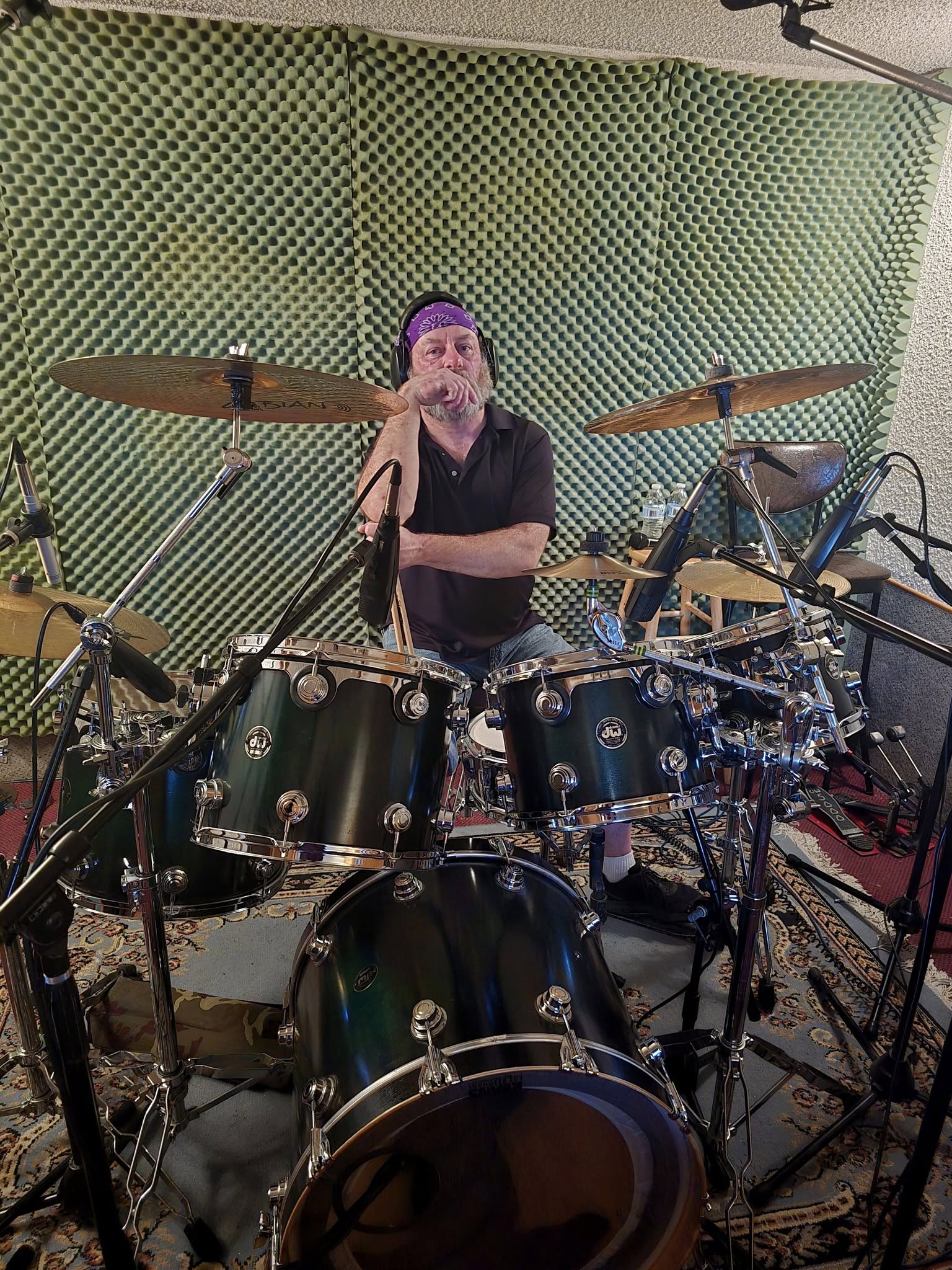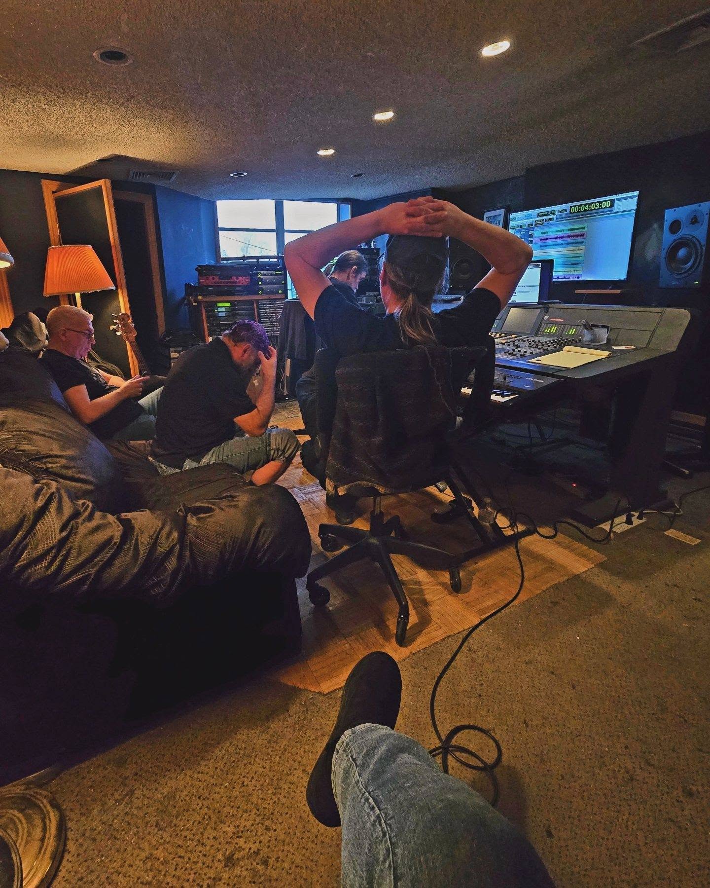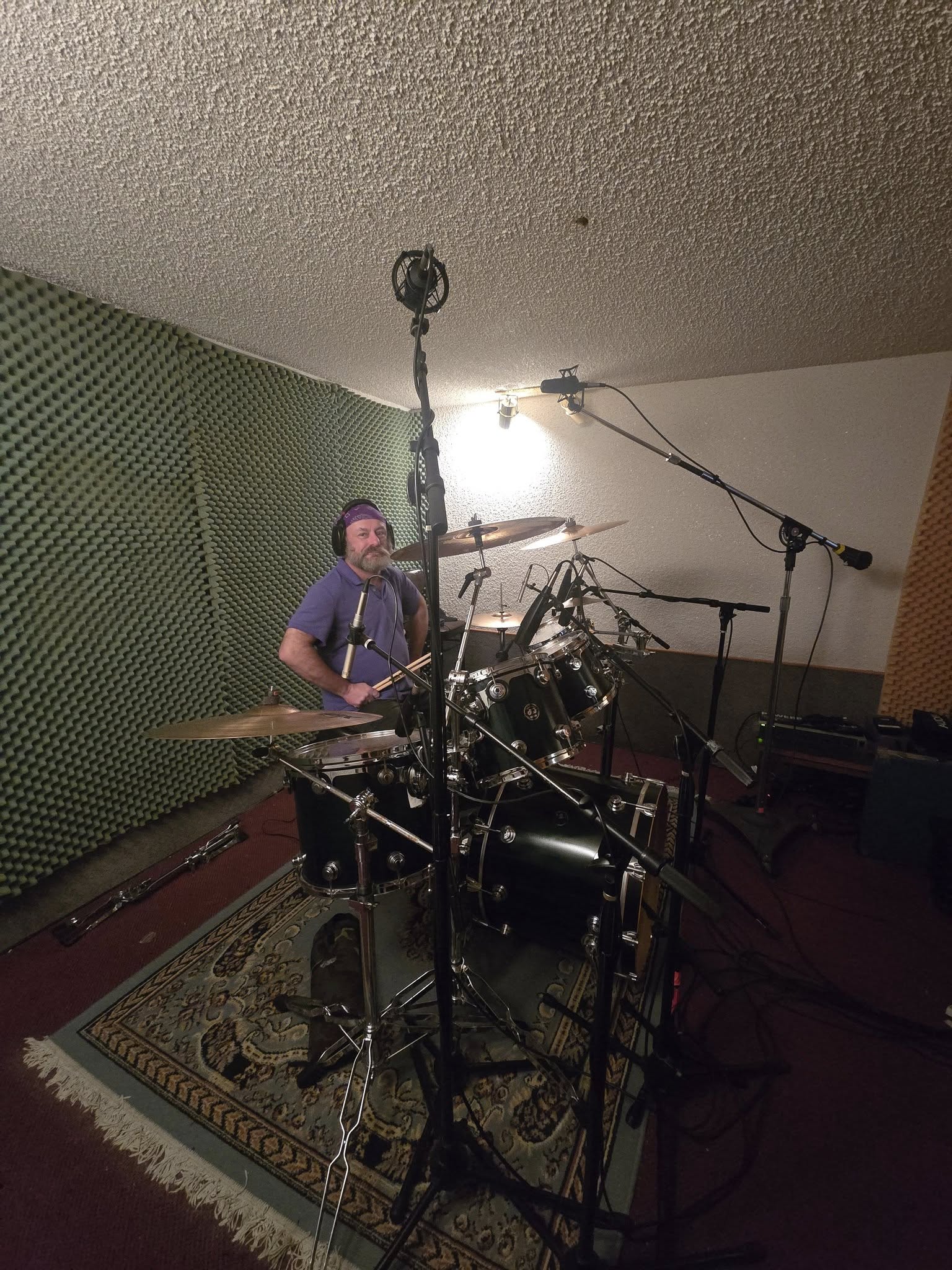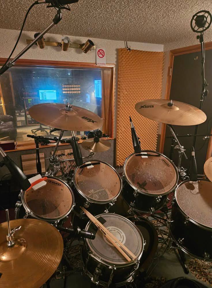 On Thursday, Tom set up his kit in the isolation booth and Mark miced everything and got the sound levels for everything to Tom’s liking. Then most of the band (minus Dean, as he had family committments), drove up Friday evening to begin tracking four of our songs. Our initial goal was to get drums recorded plus “scratch” tracks to create a template for everyone to use moving forward. The initial four songs we picked to record included “Revolve”, “Boiling Black Water”, “In Time”, and “Broken Language”.